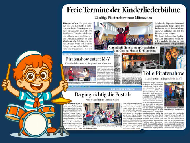 29.01. 2 x in Ribnitz- Damgarten 30.01. 2 x im Landkreis Vorpommern Greifswald 05.02. Fischland Darß 11.02. 2 x in Hamburg 12.02. Lübeck 14.02. 2 x in Kiel 27.02. Landkreis Rostock 28.02. 3 x im Landkreis Nordwestmecklenburg 01.03. Insel Usedom 19.03. Waren 31.03. Bützow 02.04. Neubrandenburg 03.04. Insel Usedom 06.05. Greifswald 07.05. Neubrandenburg 17.05. Landkreis Vorpommern-Rügen 24.05. Landkreis Mecklenburgische- Seenplatte 02.06. 2 x im Landkreis Rostock 03.06. Landkreises Ludwigslust-Parchim 05.06. Landkreis Mecklenburgische- Seenplatte 10.06. Elbe-Elster 11.06. 2 x Potsdam- Mittelmark 19.06. Teltow-Fläming 24.06. Dahme-Spreewald 25.06. 2 x Oder-Spree 27.06. Landkreis Ludwigslust-Parchim 01.07. Vorpommern- Greifswald 02.07. Vorpommern- Greifswald 04.07. 2 x Neubrandenburg 14.07. 2 x Stralsund 22.07. Piratenfest Bad Doberan 23.07. 2 x Rostock 24.07. Insel Rügen 25.07. 2 x Berlin Prenzlauer Berg 28.07. 2 x Berlin Friedrichshain-Kreuzberg 29.07. 2 x Berlin Charlottenburg-Wilmersdorf 07.08. Prenzlau 11.08. Pasewalk 12.08. Landkreis Mecklenburgische- Seenplatte 16.08. 2 x Vorpommern- Greifswald 10.09. Insel Rügen 23.09. 2 x im Landkreis Saalekreis Ein herzliches Dankeschön für den wunderbaren Frühstücksempfang und die liebevoll gestalteten Töpferarbeiten der Kinder in Mücheln zum »Tag der Zahngesundheit 2025«. 24.09. Landkreis Saalekreis 30.09. Landkreis Mecklenburgische- Seenplatte 07.11. 2 x Landkreis Ludwigslust-Parchim 19.11. Landkreis Ludwigslust-Parchim 16.12. Insel Rügen 18.12. 2 x Strasburg (Uckermark)